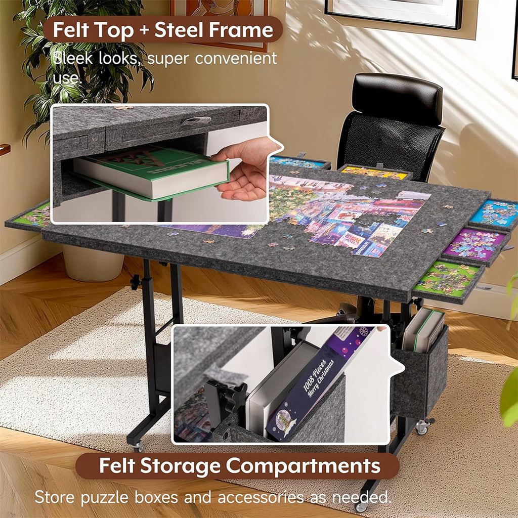 Two Felt Cover Boards & Felt Storage Bags - Enclosed with two felt covers (for 1000-piece and 2000-piece puzzles) to safeguard your work-in-progress from dust and pets. Convenient felt storage units are also included under the puzzle board and on one side of the table to provide handy spaces to store puzzle boxes or accessories.