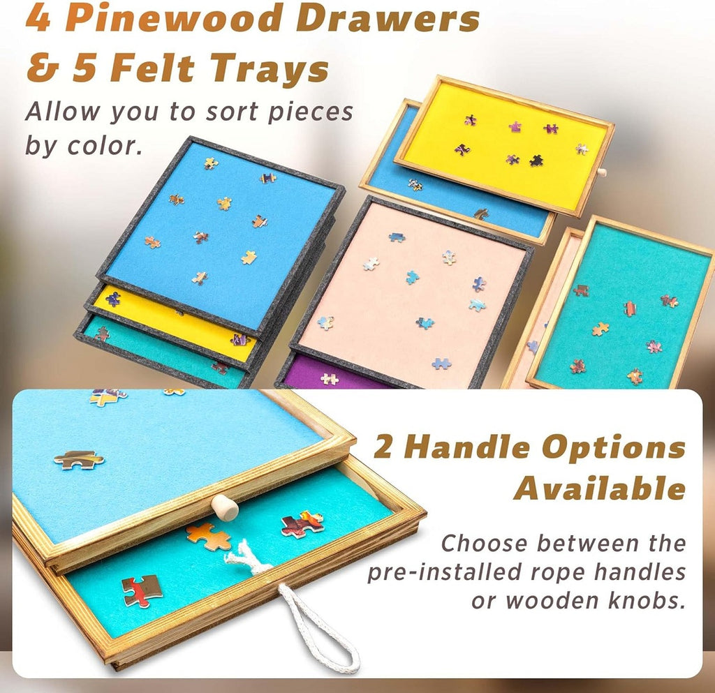 4 Pinewood Drawers & 5 Felt Trays - Two removable pinewood drawers on each side (with interchangeable handles) provide instant storage access . Five felt-lined trays under the panel offer lightweight organization by color-coding pieces. Streamlines puzzle assembly and stores unfinished pieces efficiently.