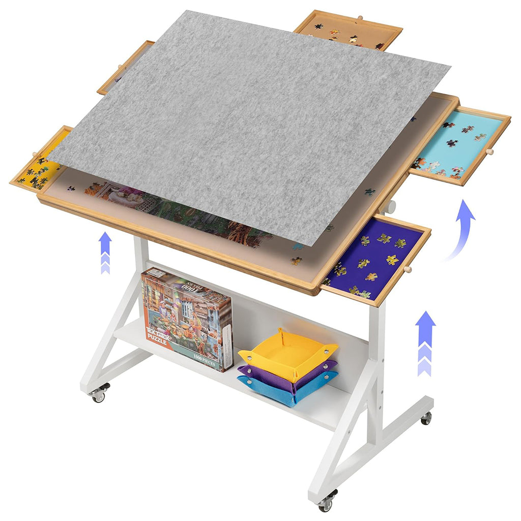 Jigsaw Puzzle Table with Angle & Height Adjustment, Puzzle Easel with Cover & 5 Sorting Drawers, Tilting Board with Legs, Enclosed with 4 Roller Wheels, for Up to 1500 Pieces.